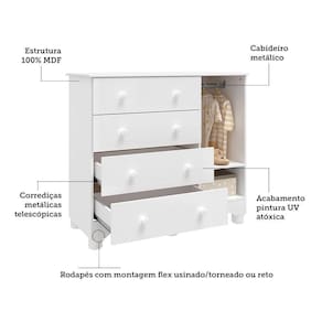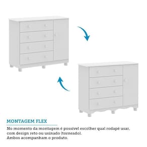 A Cômoda Infantil Júnior New 1 Porta e 4 Gavetas combina funcionalidade com um design delicado para o quarto infantil. Com estrutura em MDF e pintura UV atóxica, possui 1 porta com dobradiças metálicas, cabideiro e prateleira interna, além de 4 gavetas com corrediças telescópicas que suportam até 4kg cada. Os puxadores pontuais em plástico são práticos e seguros, e a peça oferece duas opções de rodapés usinado (torneado) ou reto permitindo adaptar ao estilo do ambiente. Os pés em plástico garantem estabilidade e o amplo espaço interno facilita a organização.