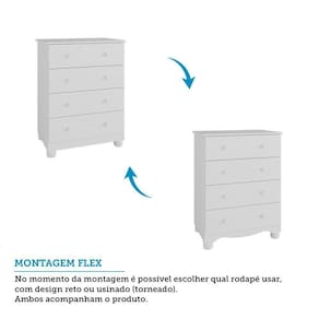 A Cômoda Infantil Júnior New é perfeita para quem busca praticidade e um visual delicado no quarto do bebê. Produzida em MDF com pintura UV atóxica, oferece 4 gavetas com corrediças telescópicas que garantem abertura suave e segura. Suporta até 4kg por gaveta e conta com puxadores pontuais em plástico, além de duas opções de rodapés usinado (torneado) ou reto que se adaptam a diferentes estilos de decoração. Com pés em plástico e ótimo espaço interno, é uma solução funcional e charmosa para o dia a dia.