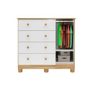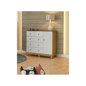 A Cômoda Júnior New 1 Porta é um produto 100% MDF e possui pintura atóxica. Sua estrutura é fabricada em chapa de 12 mm, sendo o seu tampo em chapa de 15 mm. Os pés são injetados em plástico de alta resistência. Possui puxadores plásticos, cabideiro metálico e corrediças apoiadas metálicas. Acompanha dois modelos de rodapés que podem ser definidos no momento da montagem.