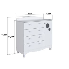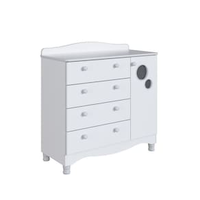 Marca: Completa Móveis | Modelo: Linha Infantil Vintage | Material: MDP | Acabamento: Fosco | Largura (cm): 93 | Altura (cm): 93,5 | Profundidade (cm): 41 | Peso do Produto (Kg): 31,10 | Quantidade de Volume: 2 | Peso Suportado (Kg): 41 | Quantidade de Gavetas: 4 | Tipo da Corrediça: Telescópica | Peso Suportado por Gaveta (Kg): 4 | Possui Chave: Não | Possui Puxador: Sim | Material do Puxador: Plástico | Quantidade de Portas: 1 | Material da Dobradiça: Metálica | Possui Prateleira: Sim | Tipo de Prateleira: Fixa | Peso Suportado por Prateleira (Kg): 5 | Quantidade de Pés: 4 | Material dos Pés: Plástico | Necessita Montagem: Sim | Nível de Dificuldade da Montagem: Médio | Sistema de Montagem: Sistema de montagem via parafusos, cavilhas, pregos, sistema minifix | País de Origem: | Duração da Garantia: 6 meses | Tipo de Garantia: Garantia do Fabricante | Dimensão (A x L x C) cm: 93,5x41x93 | Quantidade de Item: 1 | Tipo de Móvel: Cômoda | Principal Característica do Produto 01: Cômoda Infantil Organizadora | Principal Característica do Produto 02: Cômoda Infantil 4 Gavetas Grande e 1 Porta | Principal Característica do Produto 03: Cômoda Infantil Organizadora com Prateleira e Trocador | Baterias Necessárias: Não | Frágil: Não | Certificação de Teste Externo: Não Possui | Componentes Incluídos: Manual de Montagem | da Peça: ENC003 | Inclui Manual de Montagem: Sim | Cor: Branco