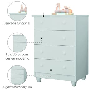 Transforme o Quarto do seu Bebê com a cômoda infantil Lara! Combinação ideal de estilo e funcionalidade. Conta com 4 gavetas com amplo espaço interno, para que as roupas e itens de seu bebê possam ser armazenados de forma ideal. A cômodaé funcional, pois sua bancada pode ser utilizada como fraldário, trazendo mais praticidade para o seu dia a dia. Confeccionado com materiais de qualidade garantindo maior durabilidade e resistência.