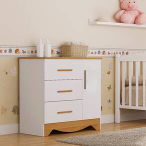 A Cômoda Infantil Popy Retrô 1 Porta Lisa Plus é a solução perfeita para quem busca organização e estilo no quarto do bebê. Produzida em 100% MDF com pintura UV atóxica, oferece resistência, segurança e acabamento sofisticado. Seu design une o moderno e o retrô, com o contraste elegante do Branco Brilhante e Amêndoa Semibrilho, combinando com diversos estilos de decoração infantil.