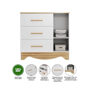 O móvel possui 3 gavetas espaçosas com corrediças telescópicas metálicas para abertura suave e silenciosa, além de 1 porta lisa para armazenar objetos maiores. Os puxadores são fabricados em MDF revestido com papel melamínico, garantindo durabilidade e charme. Acompanha dois modelos de rodapés (reto ou usinado/torneado), permitindo personalizar o acabamento durante a montagem.