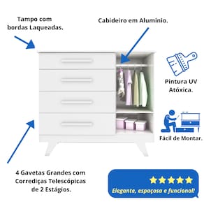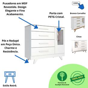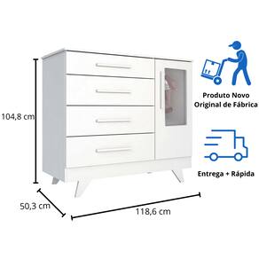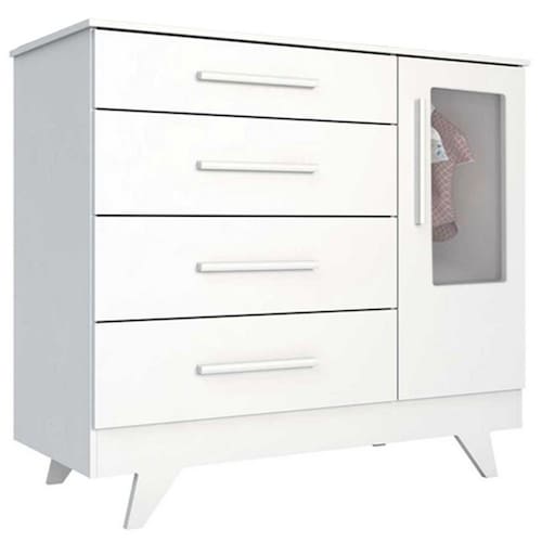 A linda Cômoda Retrô com 1 Porta com janela PETG cristal transparente da Móveis Peroba foi desenhada no estilo retrô deixando o quarto do seu bebê ainda mais elegante. Feita com material 100% MDF, com diversas utilidades, podendo ser usada como trocador e com muito espaço para manter o ambiente organizado.Tem 4 gavetas profundas que deslizam suavemente com Corrediças Telescópicas, durabilidade e segurança ao abrir e fechar. Possui o tampo com Bordas Laqueadas proporcionando um acabamento lindo e um cuidado extra para você e seu bebê. Conta ainda com 1 porta PETG cristal transparente, cabideiro metálico e 1 prateleira.FICHA TÉCNICA-Cômoda Infantil RetrôAltura: 104,8 cmLargura: 118,6 cmProfundidade: 50,3 cmQuantidade de Gavetas: 04 Gavetas (Peso suportado 4Kg)Quantidade de Portas: 01 Porta com janela PETG cristalMaterial: 100% MDFCores Disponíveis: Branco Brilho / Branco Brilho com Carvalho / Branco Brilho com CinzaAcabamento do Produto: Pintura UV Atóxica/ Pintura PU e Fita de BordoAcabamento das Portas: Lisa Pintura UV AtóxicaTipo de Corrediça: Corrediça TelescópicaTipo de Cabideiro: Cabideiro MetálicoTipo de Puxadores: MDF revestidoTipo de Pés: MDFRodapé: Desenho RetrôEmbalagem: Peças envoltas em isomanta, caixa de papelão revestidas com plástico termoencolhível.Manual de Montagem: Manual segue na embalagem do produtoRecomendações de Uso, Manutenção e Limpeza:Para limpeza utilize somente pano limpo e macio, ligeiramente umedecido em água (apenas o bastante para remover a poeira), seguido de um pano seco. Perguntas Frequentes:A - É fácil montar a Cômoda Infantil Retrô da Móveis Peroba?Sim, é fácil. Ao abrir a embalagem pode parecer complicado, mas é só seguiro passo a passo no manual de montagem que você consegue!B - Tenho a opção de comprar Berço ou Guarda Roupa Infantil Retrô separado?Sim, só buscar aqui no site que vai encontrar nossa oferta.C - Qual a configuração da Cômoda Infantil Retrô da Móveis Peroba?É uma Cômoda infantil Retrô com 4 gavetas e 1 Porta com janela PETG cristal.D - Como organizar a Cômoda infantil Retrô?Você vai naturalmente encontrar a melhor maneira de organizar sua cômoda.Entretanto, vale a pena pontuar algumas situações:1-A cômoda deve estar sempre limpa*;2-O Trocador (caso você tenha) pode ocupar bastante espaço no tampo da cômoda;3-Primeira Gaveta: Utilize para os produtos de Higiene do bebê;4-Demais Gavetas: Utilize para roupas e acessórios do bebê.E - Quais as cores disponíveis para Cômoda Infantil Retrô da Móveis Peroba?Temos nas cores Branco Brilho / Branco Brilho com Carvalho / Branco Brilho com Cinza F - Onde é fabricados a Cômoda Infantil Retrô?A Cômoda Infantil Retrô é fabricada na cidade de Linhares-ES, pela Peroba Móveis Infantis.A Peroba é atualmente uma das maiores fábricas de Móveis Infantis da América Latina.