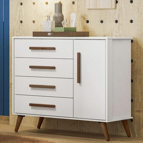 A Cômoda Retrô possui quatro gavetas com excelente profundidade e uma porta convencional com corrediças metálicas, que pode ser usada também como sapateira, para ainda mais organização para itens de vestuário e demais objetos. As gavetas são equipadas com corrediças metálicas para um deslizar suave. Os pés torneados em madeira de eucalipto com design retrô, enquanto os puxadores de em MDF, com alto padrão de acabamento, complementam o design sofisticado. O excelente acabamento revestido em pintura UV destaca ainda mais a cor escolhida, proporcionando um visual vibrante ao ambiente. Além disso, a cômoda possui sistema antitombamento, oferecendo segurança adicional para uso diário. Essa Cômoda Sapateira Infantil é para aqueles que buscam unir funcionalidade e estilo na decoração, criando um ambiente agradável e bem organizado para atender a todas as necessidades diárias.