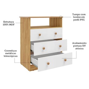 Cômoda Infantil Smim New 3 Gavetas - Móveis Peroba A Cômoda Infantil Smim New 3 Gavetas é a opção ideal para quem busca praticidade e funcionalidade no quarto do bebê. Com estrutura em MDF e pintura UV atóxica, garante segurança e durabilidade. Conta com 3 gavetas com corrediças telescópicas que suportam até 4kg cada, puxadores pontuais em plástico e tampo com bordas em perfil PVC, oferecendo maior resistência no uso diário. Seu design compacto e o amplo espaço interno facilitam a organização das roupas e acessórios infantis.