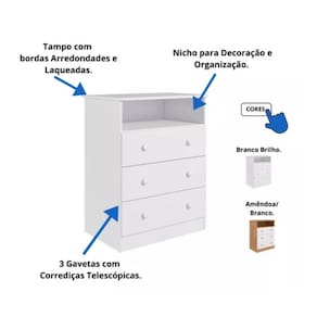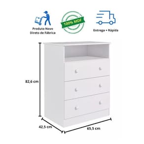 A Cômoda Infantil Smim da Peroba cor Branco referência COSMP.1.0.2, com puxadores em ABS, corrediças telescópicas, bordas laqueadas e sistema antitombamento.Com um design moderno e prático, a cômoda é a escolha ideal para quem busca qualidade e durabilidade. Comum acabamento em branco que se adapta perfeitamente a qualquer decoração. Seu design clean não só embeleza o espaço, mas também proporciona uma sensação de amplitude. Com três gavetas espaçosas, você pode facilmente organizar roupas, brinquedos e acessórios, mantendo tudo ao alcance das mãos.Fabricada em 100% MDF, a Cômoda Smim oferece segurança e resistência, tornando-se uma escolha confiável para o quarto das crianças. O material é fácil de limpar e não possui arestas cortantes, garantindo um ambiente seguro para os pequenos exploradores.