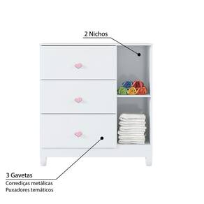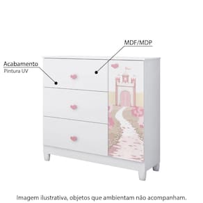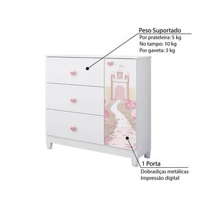 A Cômoda Infantil Sophia conta com design encantador! São 3 gavetas, todas com corrediças metálicas, e 1 porta com 2 nichos com muito espaço para guardar roupas e objetos. A Porta conta com impresão digital que estimula a imaginação das crianças. É muito encantamento para ambientar o quarto do pequeno do início da sua infância. Produzido em MDF/ MDP, garantindo maior durabilidade ao produto.