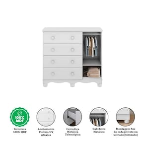A Cômoda Infantil Uli é perfeita para manter o quarto do bebê organizado com praticidade e charme. Fabricada em MDF com pintura UV atóxica, conta com 4 gavetas com corrediças telescópicas que suportam até 4kg cada e uma porta com janela em PETG Cristal/Acrílico, ideal para visualizar os itens armazenados. Internamente, possui cabideiro metálico e prateleira para acomodar roupas e acessórios. Apresenta puxadores pontuais em plástico, pés em plástico e duas opções de rodapé: um usinado (torneado) e outro reto, oferecendo versatilidade na composição do ambiente.