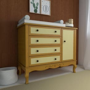 Móveis clássicos, trazendo o estilo provençal com muita sofisticação. Com design charmoso e arabescos entalhados, os móveis da linha Versailles deixam o quarto digno da realeza. A cômoda Versailles possui uma estrutura robusta e durável, pois utiliza 100% madeira maciça em sua fabricação. A sua base é reforçada, reforçando o aspecto clássico e dando maior durabilidade. O acabamento de alto padrão traz: pintura com verniz especial, aplicação de palha talagarça nas gavetas e porta e arabescos entalhados. Puxadores de metal. Possui corrediças telescópicas largas, de alta resistência. E dobradiças soft close, com fechamento com amortecimento. Acabamento da Gaveta: Verniz Acabamento da Porta: Verniz Acabamento da Prateleira: Melamínico Acabamento dos Pés: Verniz Altura dos Pés: 20 Ambiente Principal: Quarto Infantil Complexidade da Montagem: Alta: deve ser montado por um montador especializado Cor: Mel Cor do Produto: Mel Cor Interna: Marrom Escala de Brilho: Fosco Escala de Brilho da Gaveta: Fosco Escala de Brilho da Porta: Fosco Escala de Brilho da Prateleira: Fosco Gaveta com Chave: Não Itens Inclusos: 1 Cômoda, Kit Ferragens e Manual de Montagem Linha ou Coleção: Versailles Manual de Montagem e Instalação: https://cdn2.madeiramadeira.com.br/atributo/timber/1225846-manual-comoda-versailles-rev05.pdf Material da Gaveta: MDF Material da Porta: Madeira Maciça Material da Prateleira: MDF Material do Fundo: MDF Material do Puxador da Gaveta: Metal Material do Puxador da Porta: Metal Material dos Pés: Madeira Maciça Material Principal: Madeira Maciça Necessita Montagem: Sim Origem do Produto: Nacional Pés Reguláveis: Não Peso: 85 Peso Máximo por Gaveta: 5 Peso Máximo por Prateleira: 5 Possui Espelho: Não Possui Nichos: Não Possui Pés: 04 Possui Portas: 01 Possui Prateleiras: 01 Possui Trocador: Não Recomendações de Uso, Manutenção e Limpeza: Para higienização, utilizar um pano levemente umedecido. Sapatas Niveladoras: Não Sistema de Montagem: Parafusos, Minifix, Cavilhas. Suporta Até (kg): 60 Tipo de Corrediça da Gaveta: Metálica Telescópica Tipo de Dobradiça/Corrediça da Porta: Metálica Tipo de Madeira Maciça: Pinus Tipo de Madeira Maciça da Porta: Pinus Tipo de Madeira Maciça dos Pés: Pinus Tipo de Puxador da Gaveta: Externo Tipo de Puxador da Porta: Externo Marca: Timber