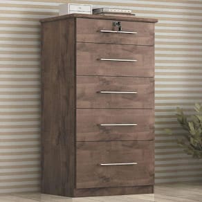 CÔMODA LARA | Com 5 gavetas e um design compacto é própria para pequenos espaços e pessoas exigentes com organização. Possui um acabamento arredondado no tampo de 25mm que enobrece o produto e o deixa mais resistente e belo. As gavetas tem corrediças metálicas o que facilitam a montagem. Suporta pesos de até 5kg em suas gavetas e 15kg no tampo suficiente para acomodar televisores. As gavetas possuem tamanhos diferentes sendo a primeira com chave, as do meio gavetas médias e a ultima um gavetão. Logo, essa cômoda é ideal para guardar roupas, assim como objetos em geral.