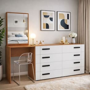 O(a) Cômoda Lisboa 8 Gavetas com Espelho Branco/Freijó - Politorno é produzido em MDP na escala de brilho Semi-Fosco, e possui um grau de dificuldade de montagem: Médio.
