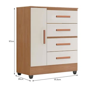 ESPECIFICAÇÕES: Estrutura em MDP Pintura UV 1 Porta Dobradiças metálicas 4 Gavetas Corrediças metálicas Prateleiras Internas Puxadores em MDF Pés em PVC Amplo espaço interno Cada gaveta suporta até 7kg