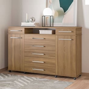 O(a) Cômoda London 7 Gavetas Amêndola Touch - Demóbile é produzido em MDP na escala de brilho Brilho e Fosca com Textura, e possui um grau de dificuldade de montagem: Médio.
