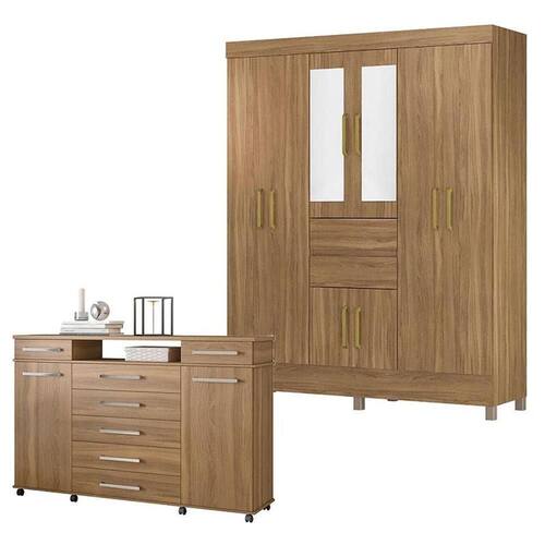 Cômoda London e Guarda Roupa Casal Munique Amêndola Touch com Espelho - Demóbile