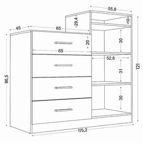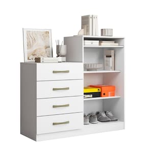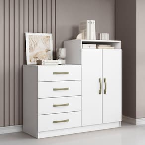 Com design moderno, 4 gavetas espaçosas com corrediças telescópicas e 2 portas com prateleiras internas, ela garante organização e praticidade para roupas e acessórios.