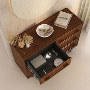 A Cômoda Grande Quarto de Casal 6 Gavetas Madeira Maciça Tecca traz o equilíbrio ideal entre design minimalista e funcionalidade. Seu acabamento em tom castanho valoriza os veios naturais da madeira, criando um móvel de presença marcante e sofisticada.