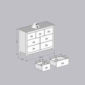ESPECIFICAÇÕES TÉCNICAS:<Br> Matéria prima madeira maciça de pinus de reflorestamento;<Br> Pintura Acetinada Verniz PU e UV;<Br> Corrediças telescópicas;<Br> Puxadores metálicos em ouro envelhecido;<Br> Pés alongados em madeira;<Br> Peso máximo suportado pelas Gavetas 05kg distribuídos);<Br> Amplo espaço para armazenamento;<Br> Isolamento de peças com manta de polietileno expandido (Isomanta);<Br> Possui manual de montagem;<Br> Sistema de montagem simples e rápida.<Br><Br>