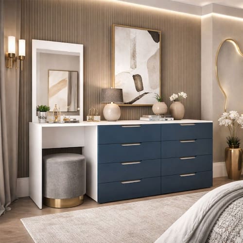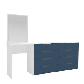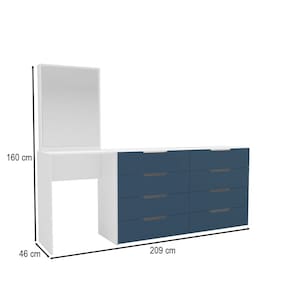 O(a) Cômoda Madrid 8 Gavetas com Espelho Azul/Branco - Politorno é produzido em MDP na escala de brilho Semi-Fosco, e possui um grau de dificuldade de montagem: Médio.