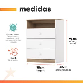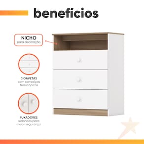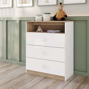A Cômoda Magia é a escolha perfeita para complementar o quarto infantil com praticidade e charme. Possui 3 gavetas espaçosas, ideais para organizar roupas e acessórios de forma funcional. Conta ainda com um nicho aberto que permite decorar ou expor objetos de uso diário, trazendo um toque especial ao ambiente. Os puxadores arredondados garantem maior segurança e facilitam o manuseio. Produzida com materiais de alta qualidade e acabamento resistente, é um móvel durável que alia organização, praticidade e um design moderno.
