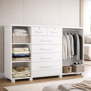 Seu grande diferencial está na versatilidade: além das gavetas espaçosas, o móvel conta com sapateira integrada e compartimentos amplos que permitem armazenar roupas, calçados e acessórios em um único lugar, otimizando o espaço do ambiente.