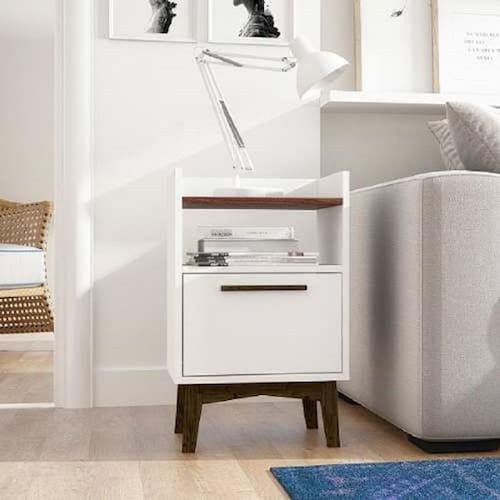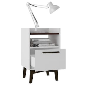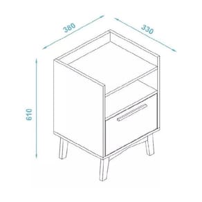 Produzido em MDP 15mm com acabamento em BP conta com seus pés em madeira maciça e puxadores em pinus, proporcionado ainda mais qualidade ao produto. Possui também 1 gaveta com corrediças metálicas e 1 prateleira na cor castanho.