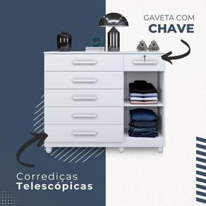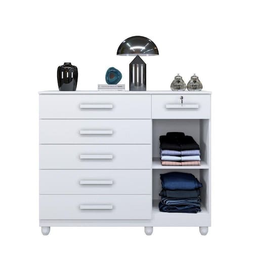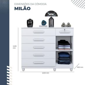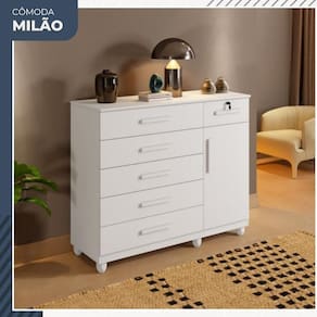 A Cômoda Milão é produzido em chapa de 15 mm que garante robustez e maior vida útil, contem 1 portas, 1 prateleira, 6 gavetas sendo 1 com chave, com corrediças telescópica, pés inclusos no produto e puxadores na cor, ótimo custo benefício.