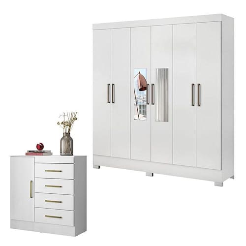 Cômoda Montevidéu e Guarda Roupa Casal Prático Branco com Espelho - Demóbile