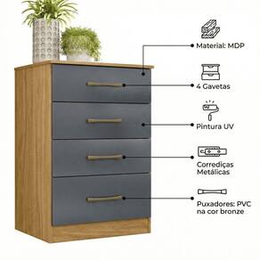 Cômoda Ms913 4 Gavetas MDF Puxadores Plástico Cinza Freijó para Quarto Organizador de Roupas