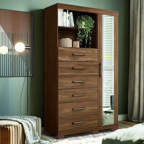 Cômoda Multiuso 1 Porta 6 Gavetas Com Pés E Espelho Marabá Santos Andirá Jatoba A Comoda Multiuso Maraba e um movel incrivel que pode ser utilizado em varios ambientes da casa: na cozinha, na garagem, no quarto, na lavandeira. Suas inumeras utilidades permitem guardar muitos objetos. Possui 6 gavetas amplas com corredicas metalicas e 1 porta com varias prateleiras. E muito espaco para guardar tudo que precisa. Caracteristicas Material da Estrutura: MDP Tipo de Acabamento: Pintura UV Quantidade de Portas: 1 Tipo de Abertura das Portas: Articuladas com dobradicas Metalicas Quantidade de Gavetas: 6 Tipo de Corredicas: Metalicas Telescopicas Tipo de Puxadores: Plastico ABS Quantidade de Prateleiras: 4 Itens Inclusos na embalagem: Comoda, kit ferragens e manual de montagem. Sistema de Montagem: Cavilhas, Parafusos e Minifix Recomendacao de Limpeza: Nao limpar com alcool ou qualquer outro produto quimico, utilize somente pano seco ou levemente umedecido. Garantia do Fabricante: 3 meses
