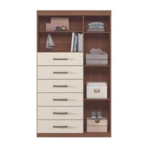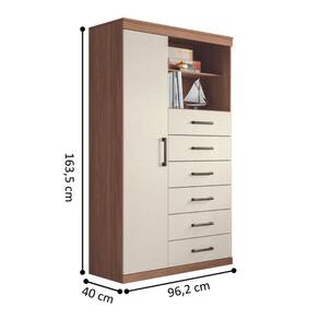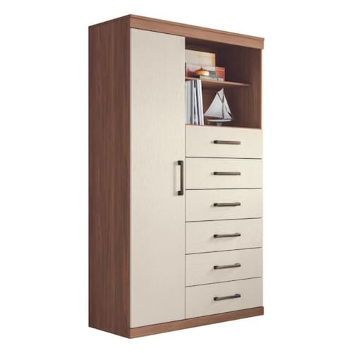 Possui uma porta com três prateleiras. Feita em MDP, contém seis amplas gavetas com corrediças telescópicas para guarda suas roupas com muita organização.