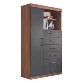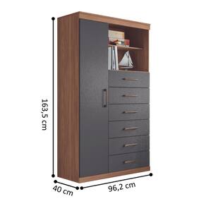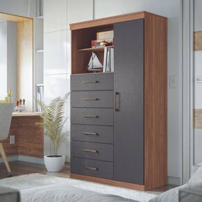 Possui uma porta com três prateleiras. Feita em MDP, contém seis amplas gavetas com corrediças telescópicas para guarda suas roupas com muita organização.
