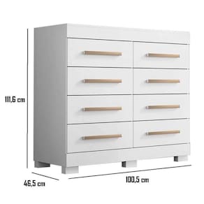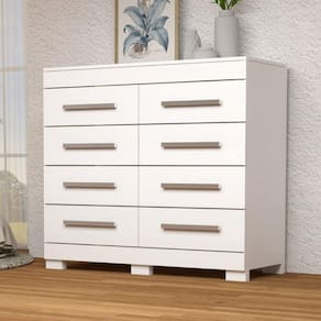 Cômoda Nalu 8 Gavetas 100% Mdf Com Pés Acp Móveis Branco Que tal a Comoda Nalu? Forma simples de deixar a rotina no dormitorio mais pratica, a Comoda Nalu e um complemento primoroso tanto para a decoracao quanto para a organizacao. Ideais para as pecas que ficam dobradas, as 8 gavetas sao reforcadas pelo tampo, que pode apoiar caixas organizadoras para aqueles objetos menores ou ate mesmo alguns enfeites que vao deixar o espaco com a sua cara. Para coroar toda essa usabilidade, a estrutura robusta ganha o contraste da coloracao leve que forma um movel harmonico e cheio de beneficios para a sua decoracao. Diferencial do Produto: Produzido em MDF 12 mm (Estrutura, Frente de gaveta,) MDF 15mm (tampo) e fundo em MDF de 2,5mm. Corredica Telescopica. Puxadores de champanhe.