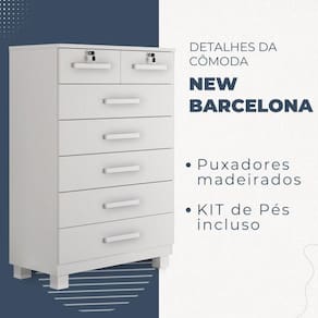 A comoda Barcelona com seu lindo design tras charme e elegancia a qualquer espaco, contem tampo de 25 mm que garante uma robustez incrivel, alem de possuir 7 gavetas, 2 gavetas com chave ainda conta com corredica telescopica que proporciona uma maior suavidade em seu uso diario, acomoda muita roupa e seus acessorios tudo muito bem organizado.