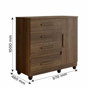 Quer um móvel para deixar seu quarto mais prático e funcional? A Cômoda Florença é perfeita para você. Possui quatro gavetas com excelente profundidade e espaço interno. As gavetas com corrediça telescópica proporcionam maior abertura e melhor aproveitamento do espaço. É fabricada com materiais de alta qualidade, oferecendo mais firmeza e durabilidade. Além disso, tem uma porta que auxilia na organização e armazenamento dos objetos. Os puxadores são madeirados, proporcionando um ótimo acabamento ao móvel.