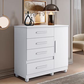 Quer um móvel para deixar seu quarto mais prático e funcional? A Cômoda Florença é perfeita para você. Possui quatro gavetas com excelente profundidade e espaço interno. As gavetas com corrediça telescópica proporcionam maior abertura e melhor aproveitamento do espaço. É fabricada com materiais de alta qualidade, oferecendo mais firmeza e durabilidade. Além disso, tem uma porta que auxilia na organização e armazenamento dos objetos. Os puxadores são madeirados, proporcionando um ótimo acabamento ao móvel.