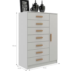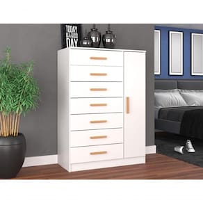 Características PrincipaisDimensões do Produto: Altura: 125 cm, Largura: 94 cm, Profundidade: 40 cm, Peso: 42 KgMaterial: MDP, garantindo resistência e durabilidade para o uso diário.Acabamento: Laca Fosco, que proporciona um toque sofisticado e fácil de e Gavetas: 1 porta e 7 gavetas com puxadores em MDF, facilitando o acesso aos seus itens.Garantia: 3 meses do fabricante, oferecendo e tranquilidade na sua compra.Dobradiça: Metálica, que assegura maior durabilidade e resistência ao móvel.Corrediças: Plásticas, garantindo um deslizamento suave das suportado das gavetas: 10 KG, ideal para armazenar diversos itens com .Quantidade de gavetas: 7, promovendo uma organização eficiente e prática.Quantidade de portas: 1, para um acesso prático e rápido.Espessura do MDP: 12 mm, conferindo robustez e resistência ao móvel.Acompanha manual de montagem, sendo a montagem de responsabilidade do comprador.