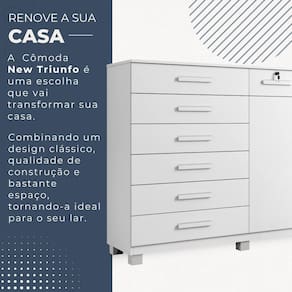 Comoda New Triunfo 8 Gavetas 2 Portas Benetil Moveis Quer um movel pratico e funcional para o quarto? A Comoda Triunfo e ideal! As oito gavetas contam com amplo espaco interno, alem de otima profundidade, deixando tudo mais organizado. Alem disso, possuem corredicas telescopicas e chave em uma das gavetas. Os puxadores sao madeirados, proporcionando um otimo acabamento ao movel. A estrutura do tampo em MDP 15mm proporciona mais firmeza e durabilidade. E ideal para deixar o quarto mais pratico e bonito!