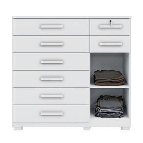 Cômoda New Vitoria 8 Gavetas Com Sapateira - Benetil Branco A Comoda New Vitoria complementa seu quarto com charme e sofisticacao, combinando praticidade e beleza. Com oito gavetas espacosas, sendo uma com chave para maior seguranca, oferece organizacao e seguranca para seus itens pessoais. Suas corredicas telescopicas proporcionam suavidade e resistencia no uso diario. Conta ainda com uma porta e prateleira interna, formando uma sapateira bem estruturada. Fabricada em chapa de 15 mm, garante durabilidade e robustez superiores. Com a tecnologia MDP Perfect, alia sustentabilidade e inovacao, proporcionando longa vida util e facil manutencao. A pintura UV de alta resistencia e facil de limpar e ecologicamente correta, feita com madeira de reflorestamento para uma escolha mais sustentavel. Caracteristicas: Material Principal: Mdp Espessura Da Chapa: 15 Mm Escala De Brilho: Semi Brilho Acabamento: Pintura UV Sistema De Montagem: Parafuso, Cavilha E Cantoneiras Metalicas Quantidade de Gavetas: 08 Quantidade de Portas: 01