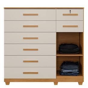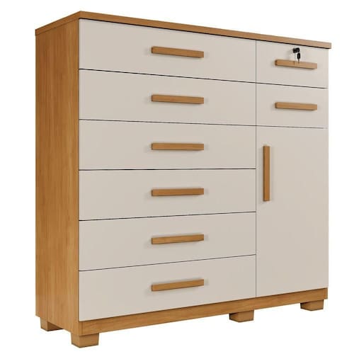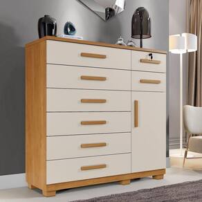 Cômoda New Vitoria 8 Gavetas Com Sapateira - Benetil Cinamomo Off A Comoda New Vitoria complementa seu quarto com charme e sofisticacao, combinando praticidade e beleza. Com oito gavetas espacosas, sendo uma com chave para maior seguranca, oferece organizacao e seguranca para seus itens pessoais. Suas corredicas telescopicas proporcionam suavidade e resistencia no uso diario. Conta ainda com uma porta e prateleira interna, formando uma sapateira bem estruturada. Fabricada em chapa de 15 mm, garante durabilidade e robustez superiores. Com a tecnologia MDP Perfect, alia sustentabilidade e inovacao, proporcionando longa vida util e facil manutencao. A pintura UV de alta resistencia e facil de limpar e ecologicamente correta, feita com madeira de reflorestamento para uma escolha mais sustentavel. Caracteristicas: Material Principal: Mdp Espessura Da Chapa: 15 Mm Escala De Brilho: Semi Brilho Acabamento: Pintura UV Sistema De Montagem: Parafuso, Cavilha E Cantoneiras Metalicas Quantidade de Gavetas: 08 Quantidade de Portas: 01