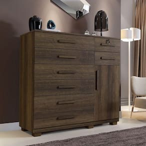 Cômoda New Vitoria 8 Gavetas Com Sapateira - Benetil Imbuia A Comoda New Vitoria complementa seu quarto com charme e sofisticacao, combinando praticidade e beleza. Com oito gavetas espacosas, sendo uma com chave para maior seguranca, oferece organizacao e seguranca para seus itens pessoais. Suas corredicas telescopicas proporcionam suavidade e resistencia no uso diario. Conta ainda com uma porta e prateleira interna, formando uma sapateira bem estruturada. Fabricada em chapa de 15 mm, garante durabilidade e robustez superiores. Com a tecnologia MDP Perfect, alia sustentabilidade e inovacao, proporcionando longa vida util e facil manutencao. A pintura UV de alta resistencia e facil de limpar e ecologicamente correta, feita com madeira de reflorestamento para uma escolha mais sustentavel. Caracteristicas: Material Principal: Mdp Espessura Da Chapa: 15 Mm Escala De Brilho: Semi Brilho Acabamento: Pintura UV Sistema De Montagem: Parafuso, Cavilha E Cantoneiras Metalicas Quantidade de Gavetas: 08 Quantidade de Portas: 01