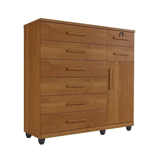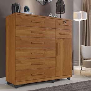Cômoda New Vitoria Com Porta E 8 Gavetas Benetil Cinamomo Procurando um móvel prático e funcional para o quarto? A Cômoda Vitória é excelente! Ela oferece conforto e comodidade. As oito gavetas contam com amplo espaço interno, além de ótima profundidade, deixando tudo mais organizado. Além disso, possuem corrediças telescópicas e chave em uma das gavetas. Os puxadores são madeirados, proporcionando um ótimo acabamento ao móvel. É ideal para deixar o quarto mais prático e bonito! Características: Marca: Benetil Estilo: Moderno Origem do produto: Nacional Material principal: MDP Ambiente principal: Quarto Escala de Brilho: Fosco Possui gavetas: Sim, 8. Possui chaves: Sim Tipo de Corrediça: Telescópica Tipo de Puxador: Madeirado Possui portas: Sim Possui prateleira: Sim, interna. Cabideiro: Não Necessita Montagem: Sim