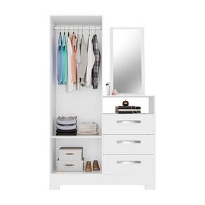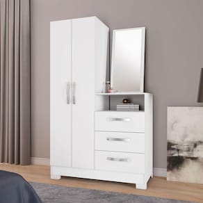 Ideal para a organização do seu quarto, a Cômoda NT 5165 da Notável Móveis conta com prateleira e cabideiro interno, 3 gavetas bem espaçosas, nicho, além de um espelho inclinado para ajudar você a sair todos os dias bem arrumado(a)!Dimensões do Produto montado:Altura: 178 cmLargura: 107,9 cmProfundidade: 39,3 cmObservações:-Espelho inclinado-Prateleira e cabideiro interno-Corrediças metálicas-Puxadores em PVC-Pintura Ultravioleta na cor Branco