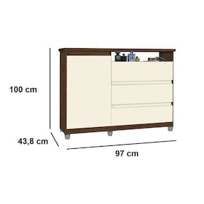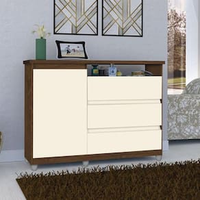 Aliada da organização do seu dormitório, a Cômoda Sky é a peça que faltava para garantir um dia a dia mais otimizado e um ambiente bem decorado. Ela pode ter o uso compartilhado com o do guarda-roupa já que as gavetas se reservam para peças menores e dobráveis, mas se o seu cômodo é pequeno, ela também vai bem como a protagonista para deixar tudo sempre à mão. Ah, além do visual charmoso que ajuda na composição do lar-style, a peça ainda tem um amplo tampo para você dispor cosméticos, enfeites ou outros itens pertinentes à sua rotina. Agora é só combiná-la com o restante do mobiliário e conquistar o quarto dos seus sonhos! Descrição do TamanhoAltura: 100 cmLargura: 97 cmProfundidade: 43,8 cm Características:Número de portas: 1 PortaNúmero de gavetas: 3 GavetasTipo de pé: Fixo de PVCAcabamento: FoscoMaterial da dobradiça/trilho da porta MetalMaterial da estrutura MDPEspessura do material da estrutura (mm) 12Número de nichos: 1Número de pés 6Peso suportado máximo (kg) 60 Atenção!- Confira as dimensões deste produto e certifique-se de que passará normalmente por supostos elevadores, portas, escadas e/ou corredores de sua moradia;- As imagens são ilustrativas, eletrodomésticos e demais objetos que compõem o cenário, não fazem parte do anúncio;- Sobre a tonalidade das cores, poderá ocorrer alterações conforme a configuração do seu monitor. - Orientamos que a montagem e instalações do produto seja realizado por um técnico de sua confiança, após a sua entrega. - Oferecemos retirada em nossa loja Saimys Móveis na Av. Ragueb Chohfi, °3411 (08341-420) para não haver custo de envio.