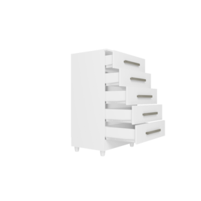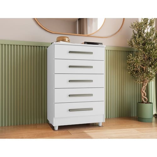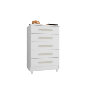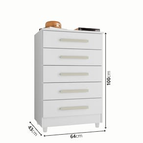 - Estrutura: MDP e MDF; - 5 gavetas espaçosas com puxadores modernos; - Pés e puxadores em PVC; - Ideal para roupas, acessórios e itens diversos; - Design clean e contemporâneo; - Estrutura resistente com excelente acabamento; - Versátil: pode ser usada no quarto, closet ou escritório.
