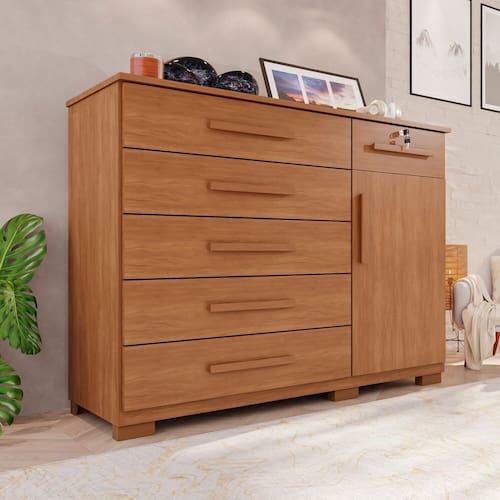 Cômoda com 1 porta e 6 gavetas, fabricada com estrutura de 15mm, garantindo resistência e durabilidade. As chapas em Perfect Wood oferecem alta resistência a fungos e bactérias, garantindo mais higiene e durabilidade. A tecnologia de termo-fusão reforça a estrutura, proporcionando maior resistência ao uso diário. Um material inovador que une qualidade, segurança e longa vida útil. Gavetas espaçosas permitem armazenar roupas, acessórios e diversos itens com praticidade. Uma gaveta possui chave, proporcionando mais segurança para objetos pessoais. Perfeita para complementar qualquer ambiente com elegância e utilidade. Produto Montado: Sim Acabamento da Gaveta: Melamínico Acabamento da Porta: Melamínico Acabamento da Prateleira: Melamínico Ambiente Principal: Quarto codigo_ean: 7900288106803 Complexidade da Montagem: Média: pode ser montado por mais de uma pessoa e/ou necessite de maior conhecimento para montagem Cor: Cinamomo Cor do Produto: Cinamomo Escala de Brilho: Fosco Escala de Brilho da Porta: Fosco Escala de Brilho da Prateleira: Fosco Gaveta com Chave: Sim Itens Inclusos: 1 Cômoda, Manual de Montagem e Kit Ferragens. Linha ou Coleção: Jade Manual de Montagem e Instalação: https://product-hub-prd.madeiramadeira.com.br/983725/documents/03ef9d64-c5f3-4380-b9b6-6cf6f21b9928277555549381743510246205.pdf Marca: Espresso Móveis Material da Gaveta: MDP Material da Porta: MDP Material da Prateleira: MDP Material do Fundo: mdf Material dos Pés: PVC Material Principal: MDP Necessita Montagem: Sim Origem do Produto: Nacional Peso: 57 kg Peso Máximo por Gaveta: 3 kg Peso Máximo por Prateleira: 5 kg Possui Espelho: Não Possui Nichos: Não Possui Pés: 06 Possui Portas: Sim Possui Prateleiras: Sim Possui Rodízio: Não Recomendações de Uso, Manutenção e Limpeza: Limpeza com pano macio e levemente umedecido. Não utilizar solventes a base e de inflamáveis. Não utilizar produtos abrasivos. Sapatas Niveladoras: Não Sistema de Montagem: Parafusos e cavilhas Suporta Até (kg): 23 kg Tipo de Corrediça da Gaveta: Metálica Telescópica Tipo de Dobradiça/Corrediça da Porta: Aço Tipo de Porta: Bater Tipo de Puxador da Gaveta: Externo Tipo de Puxador da Porta: Externo
