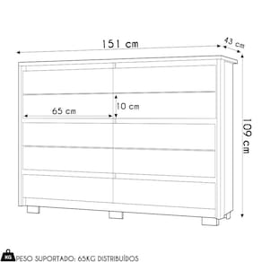 Interna das Gavetas (L x A x P): 65 x 10 x 33 cm cada.