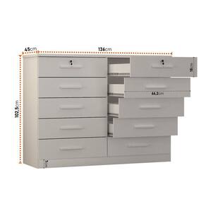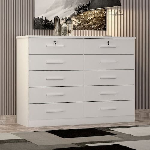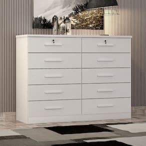 Cômoda com 10 gavetas amplas com corrediças telescópicas com abertura total e trava de segurança, 02 gavetas com chave, puxadores externo amadeirado, tampo resistente de 2,5cm em MDF proporcionando qualidade para o seu móvel. Produto Montado: Sim Acabamento da Gaveta: Pintura UV Ambiente Principal: Quarto codigo_ean: 7900288221728 Complexidade da Montagem: Média: pode ser montado por mais de uma pessoa e/ou necessite de maior conhecimento para montagem Cor: Neve Cor do Produto: Neve Cor Interna: Branco Escala de Brilho: Semi-Brilho Escala de Brilho da Gaveta: Semi-Brilho Gaveta com Chave: Sim Itens Inclusos: 1 Cômoda, Kit Ferragens e Manual de Montagem Linha ou Coleção: Genova Manual de Montagem e Instalação: https://product-hub-prd.madeiramadeira.com.br/514306216/documents/6365aba3-ad06-4088-89aa-2b8254d333b03121840413217545670879362.pdf Marca: Novo Horizonte Material da Gaveta: MDF/MDP Material do Fundo: MDP Material do Puxador da Gaveta: MDF Material Principal: MDF/MDP Necessita Montagem: Sim Origem do Produto: Nacional Peso: 73 kg Peso Máximo por Gaveta: 5 kg Possui Espelho: Não Possui Nichos: Não Possui Pés: Não Possui Portas: Não Possui Prateleiras: Não Quantidade de Gavetas: 10 Gavetas Recomendações de Uso, Manutenção e Limpeza: Pano úmido, sem uso adicional de produto abrasivos Sapatas Niveladoras: Não Sistema de Montagem: Parafusos, cavilhas entre outros. Suporta Até (kg): 55 kg Tipo de Cômoda: Adulto Tipo de Corrediça da Gaveta: Metálica Telescópica Tipo de Puxador da Gaveta: Externo