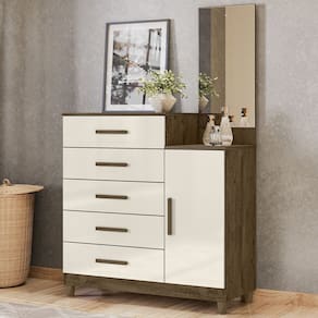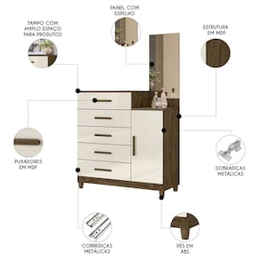 Com cinco gavetas espaçosas com corrediças metálicas, e uma porta com puxadores em MDF, você tem espaço de sobra para guardar roupas, acessórios, documentos e muito mais. A prateleira interna é ideal para manter tudo organizado e o tampo amplo com espaço para produtos de uso do dia a dia para manter sempre ao alcance das mãos.