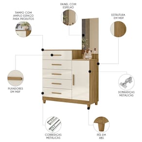 Produzida em MDP de 12mm, essa Cômoda oferece resistência e durabilidade, com acabamento de qualidade que valoriza o móvel e o seu espaço. O espelho integrado agrega ainda mais funcionalidade, sendo perfeito para a hora de se arrumar ou dar aquele toque final no visual.